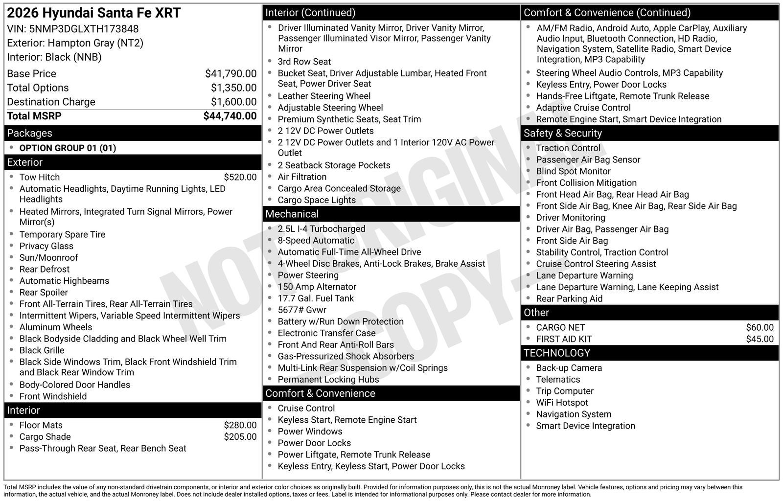 This online window sticker is provided for informational purposes only. Vehicle features, options, pricing and other information are subject to change. See your Hyundai dealer and the Monroney label affixed to the actual vehicle for the most up-to-date specifications and information.